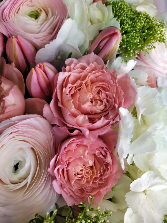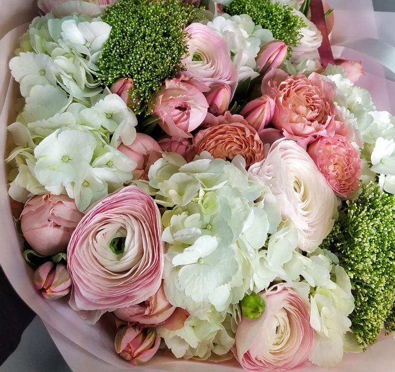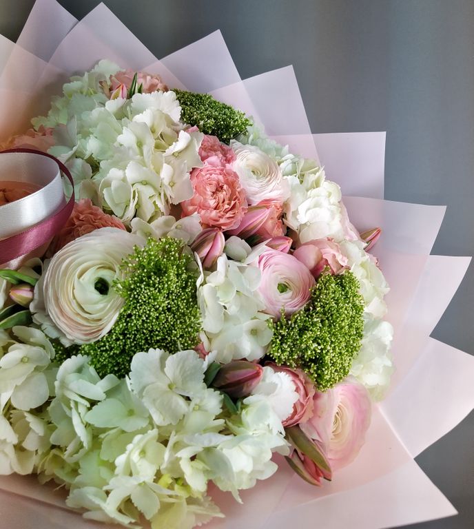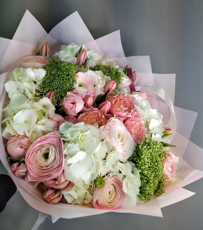 Нежнейшее сочетание ранункулюсов, пионовидных роз и невероятно нежных тюльпанов! Букет упакован в корейскую матовую пленку и украшен походящими по цвету атласными лентами.